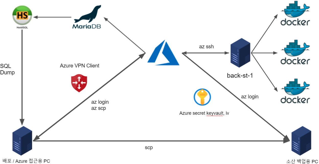 3. SCP를 다시 이용하여 소산 백업용 PC에 백업file을 옮겨주며 소산 백업PC역시 마찬가지로 Azure login 후에 Azure에서 관리되고있는 keyvault, iv 값을 받아와 openssl commend를 이용 하여 AES-256 암호화 알고리즘을 적용하여 대상 파일을 enc 파일로 추출한다. 추출 후에는 반드시 원본 파일을 지운다.