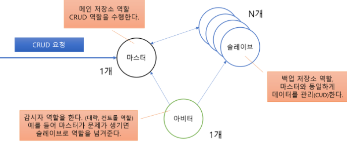 MongoDB 에서 레플리카 셋 서버 구성을 한다고 했을 때, 각각의 마스터서버, 슬레이브 서버만 생각하기 마련이다. 하지만 여기서 추가적으로 '아비터 서버'라는 것이 구성될 수 있다. 각각의 서버들의 개념을 살펴보면 다음과 같다. 1. 마스터 서버(1개) : 메인 데이터베이스 서버, 사용자가 접속하는 대상 서버 2. 슬레이브 서버(n개) : 서브 형태의 서버, 마스터 서버와의 데이터를 동기화하는 서버 3. 아비터 서버(1개) : 감시용 서버, 문제가 생긴 서버를 대신해서 동작할 다른 서버를 지정하는 등의 역할을 하는 서버 마스터에 문제가 생겨 슬레이브 노드로 대체 한다고 했을 때 이것이 당연하게 이루어 지는게 아니라, 아비터 서버를 통해서 아비터 서버가 마스터에서 어떤 문제가 생기는지 감시하고 문제가 ..
