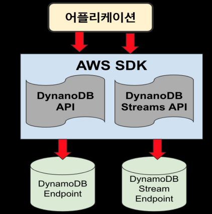 DynamoDB Stream DynamoDB 테이블에서 일어나는 일들(삽입, 수정, 삭제 등)이 일어날 시 시간적 순서에 맞게 Streams에 기록 Log는 즉각 암호화가 일어나며 24시간동안 보관됨 → 24시간 후 로그 소멸 주로 이벤트를 기록하고 이벤트 발생을 외부로 알리는 용도 (예시 : Lambda Function) 이벤트 전&후에 대한 상황 보관 (24시간 유효) 어플리케이션이 2개의 AWS SDK와 연동이 되어있다고 가정할때 한가지 예시로는 DynamoDB API며 직접 소통하며 하나의 고유한 Endpoint와 연결 하나의 API는 하나의 EndPoint와 연결이 된다 라고 볼 수 있다. ex) 쇼핑몰을 운영한다 할때, 고객이 물건을 구매할 때 이벤트로 인식하여 람다함수가 실행 SNS로 메세지..