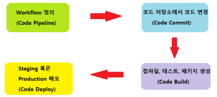 Code Pipeline = CI/CD 의 끝판왕 처리를 자동으로 해주며, 관리해줌 Code Pipeline이 하는 일은 ? 빌드, 테스트, 배포 과정을 관리 코드 변경 시 Code Pipeline은 이를 감지할 수 있음 소프트웨어 및 어플리케이션 출시 자동화 가능 빠르고 쉬운 디버깅을 가능케 해줌 배포(Deployment) VS 출시(Release) 출시는 최종적으로 사용자에게 제공하는 환경이며, 모든 테스트와 배포를 거친 후의 단계 배포는 100% 세상 밖으로 나오기 바로 전 단계를 의미 Code Pipeline 작동 방법 workflow - 코드 저장소에서 특정 코드가 변경되었을 시에 시작이 된다. code commit 에서 정의된 레포지토리에서 작동한다. 코드의 추가 및 수정 삭제 등 그럴 때마다..